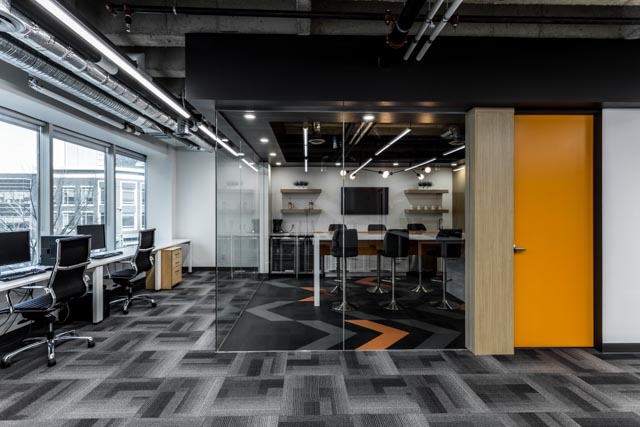 SOS Media Corp. is situated in our very own Jaffer Building in Downtown Edmonton. With a need for more open space for web design, development, and creativity, open plan workstations were designed to prevent employee segregation, increase interaction and foster collaboration between team members. A collaboration area in the core of this 1,706 sq. ft. office serves as a focal point to the open workstations. The room is enclosed with walls of floor to ceiling glass complemented by aged ash woodwork, striking pop of color, exposed ceilings, chevron-patterned floor tiles, and modern light fixtures.